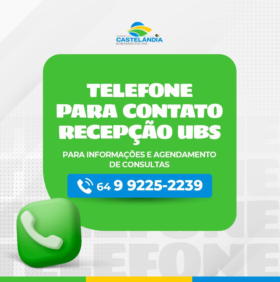Informamos o número de telefone para contato na recepção da Unidade Básica de Saúde de Castelândia para informações e agendamento de consultas.: (64) 9 9225-2239.
